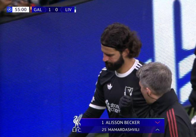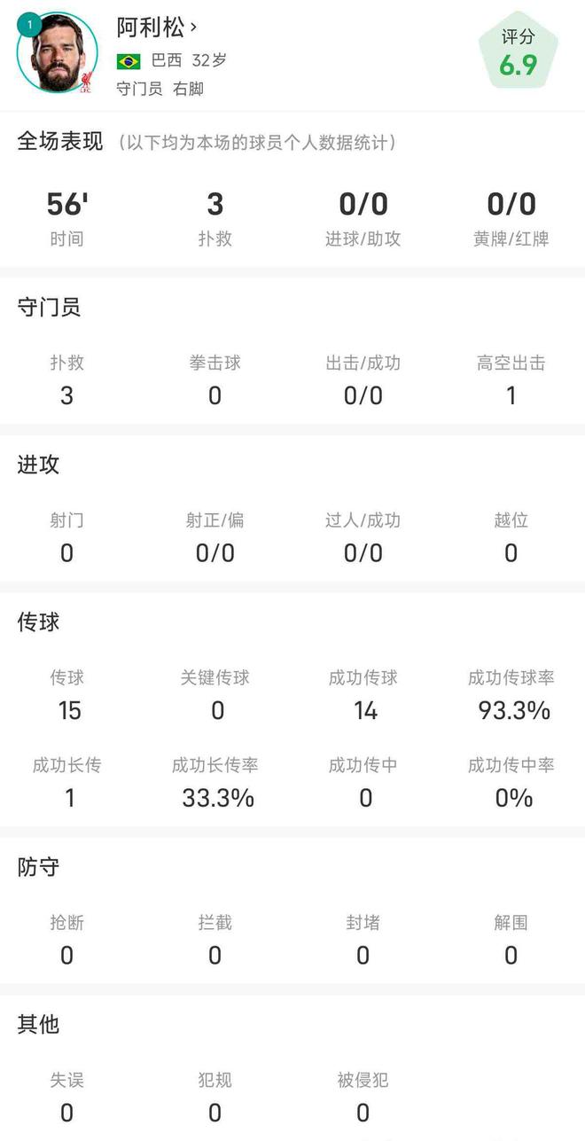 本场比赛利物浦门将阿利松出场56分钟,因伤被提前换下。