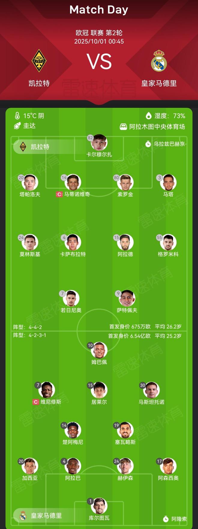 值得一提的是,两队首发身价相差悬殊:凯拉特首发总身价只有675万欧元,而皇马首发11人总身价为6.54亿欧元,是凯拉特首发总身价的96.9倍。